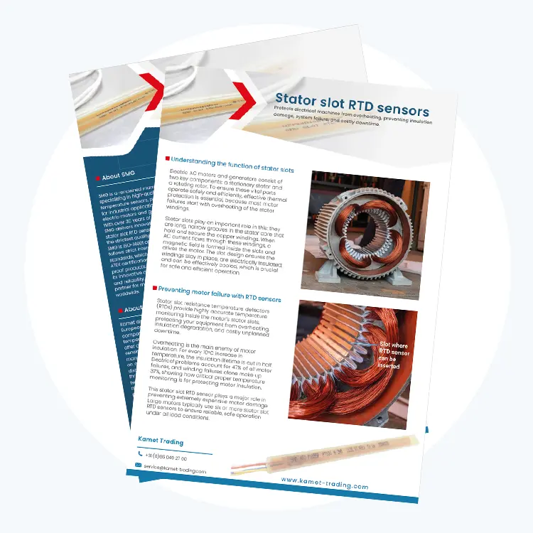 Stator yuvası RTD’lerimiz Güney Kore’de SMG tarafından üretilmektedir. Dünya çapında güvenilen SMG, kanıtlanmış Kore mühendisliğiyle desteklenen yüksek performanslı termal koruma sunar. Stator yuvası RTD’lerinin çoğu, müşterinin uygulama ve performans gereksinimlerine tam olarak uyarlanmış, özel olarak tasarlanmış çözümler olarak teslim edilir.